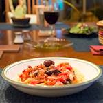 This is an adaptation of pasta puttanesca. I used stewed tomatoes once instead of fresh because...well, I can’t remember why, but I liked the result better than the original.